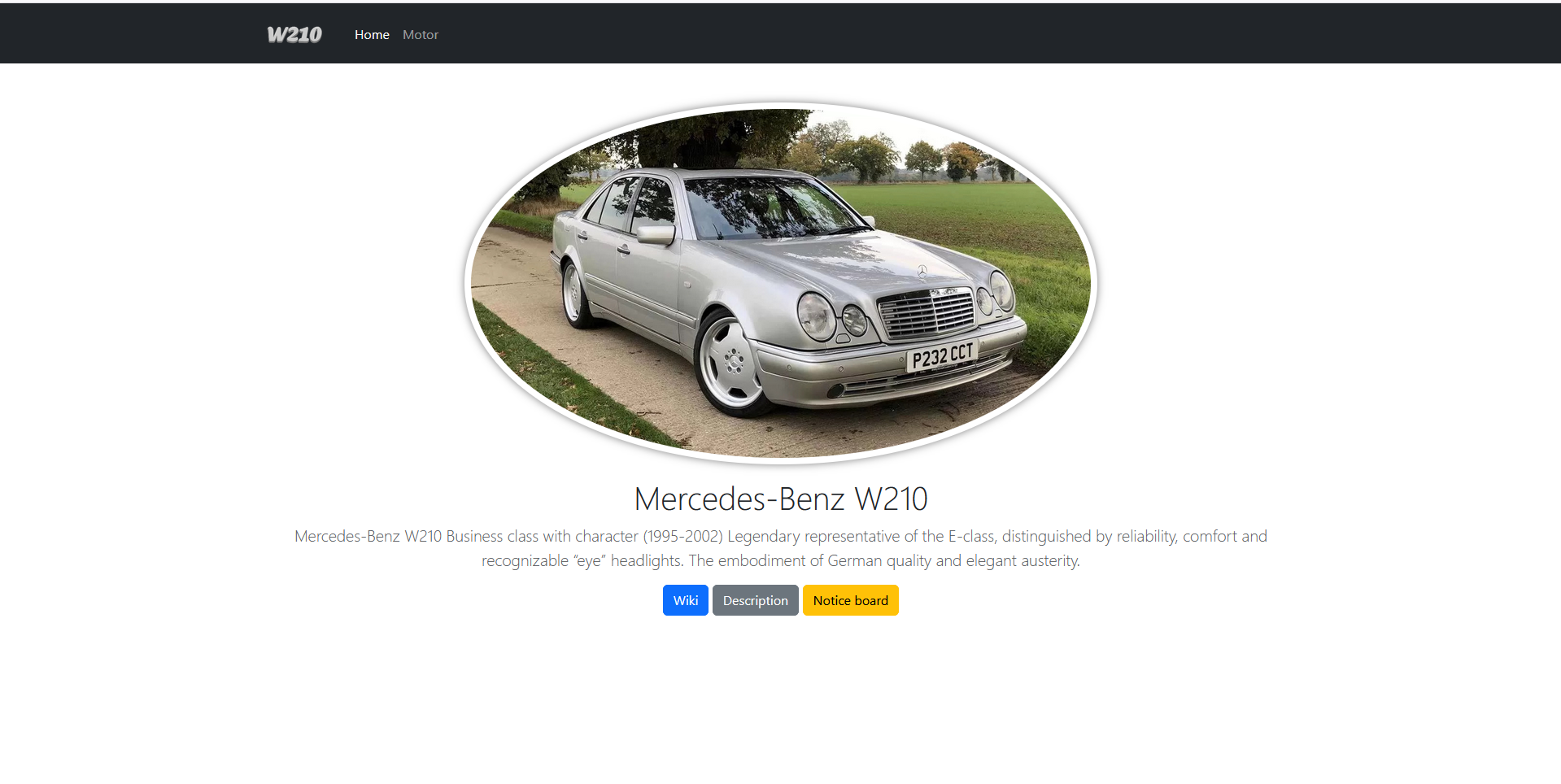 This screenshot shows the home page of my website. Here we can see a framed photo and a description of the car. The website was created about the engines of Mercedes-Benz w210 cars. At the top, you can see the “w210” logo and the ‘home’ and “engines” navigation buttons. Below the text are three hyperlinks: “Wiki” redirects to Wikipedia about the car, ‘Description’ is information from an article about the car, and the last one, “Notice Board,” is a Ukrainian marketplace where you can see such cars for sale.
